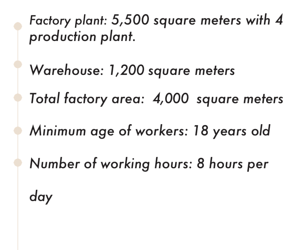 The factory was built in 1999 included 2 production plants with 2 fully equipped workshops and 1 warehouse.